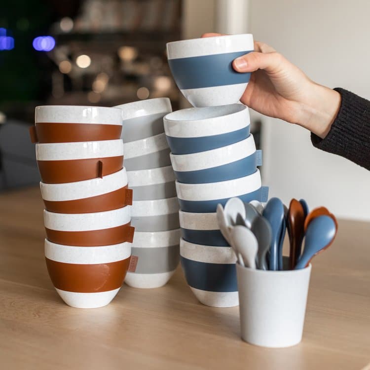 Die natürliche Kollektion mit Zellulose: 100% reines Material, 100% recyclebar, extrem langlebig, ohne Schadstoffe, lebensmittelecht, geschmacksneutral und spülmachinengeeignet.