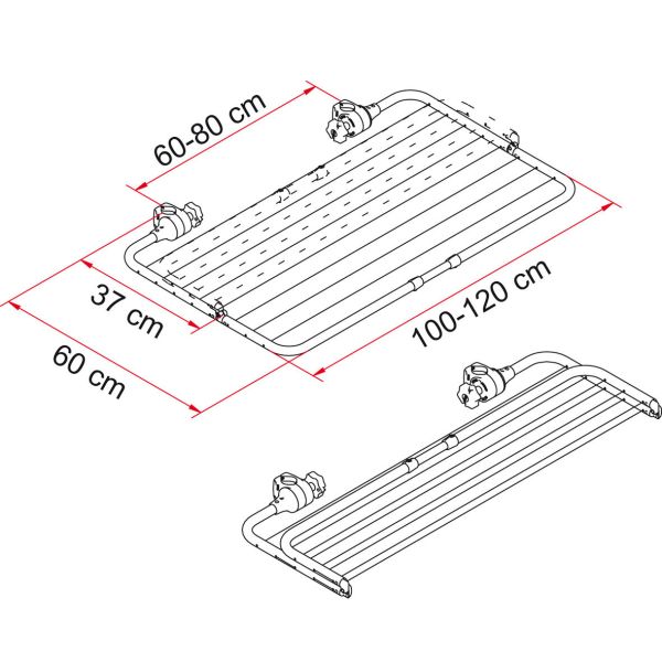 Wäscheständer, der sich an den Auflagebügel der meisten Fahrradträger mit 35 mm Rohr anbringen lässt. Wird ohne Bohren an die Carry-Bikes mit einem Achsenabstand von 60 – 80 cm angebracht. Die Endstücke haken sich an den Rohren des Auflagebügels ein und der Ständer lässt sich durch Einrasten ohne Mühe montieren. Das Reisen ist dank der klappbaren, innovativen Struktur im geschlossenen Zustand möglich. Ausgeliefert mit Plastikseilen für die aufzuhängenden Textilien und mit Feststellschraube zum Fixieren. Bei den Modellen Pro und Pro C Fiamma ist die Kompatibilität nur für die Versionen vor 2023 (runde Rohre) gewährleistet. Verstellbare Breite von 100 cm auf 120 cm. Auszug: verschlossen 37 cm, geöffnet 60 cm.