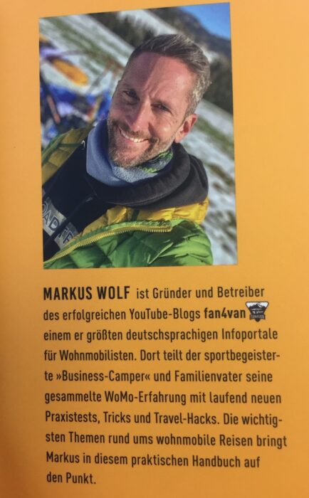 Markus Wolf ist Autor des erfolgreichen YouTube-Blogs »fan4van«, einem der größten deutschsprachigen Infoportale für Wohnmobilisten. Dort teilt der sportbegeisterte »Businesscamper« und Familienvater seine gesammelte WoMo-Erfahrung mit laufend neuen Praxistests, Tricks und Travel-Hacks mit einem Millionenpublikum.