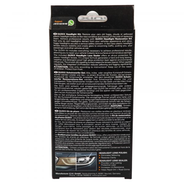 Alte, trübe oder vergilbte Kunststoff-Scheinwerfer werden wieder wie neu – zu einem Bruchteil der Kosten, die bei einem Austausch der Scheinwerfer entstehen. Trübe Scheinwerfer mindern nicht nur die Optik und den Wert Ihres Fahrzeuges, sie stellen auch ein ernstzunehmendes Sicherheitsproblem dar. Die Sicht wird schlecht und entgegenkommende Verkehrsteilnehmer werden geblendet. QUIXX enthält alles, was für ein professionelles Ergebnis erforderlich ist.